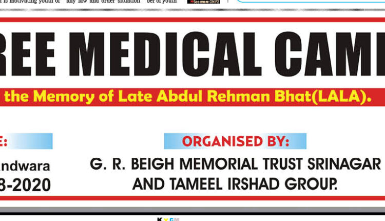 سرینگر :۲۱؍اگست: جی آر بیگ میموریل ٹرسٹ اورتعمیل شاد کے باہمی اشتراک سے 23اگست بروز اتوار کو ہندواہ میں ایک طبی کیمپ منعقد کیا جارہا ہے۔جس میں سکمز سے وابستہ اعلیٰ ڈاکٹر صاحبان شرکت کریں گے۔