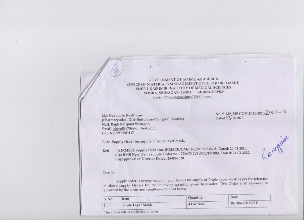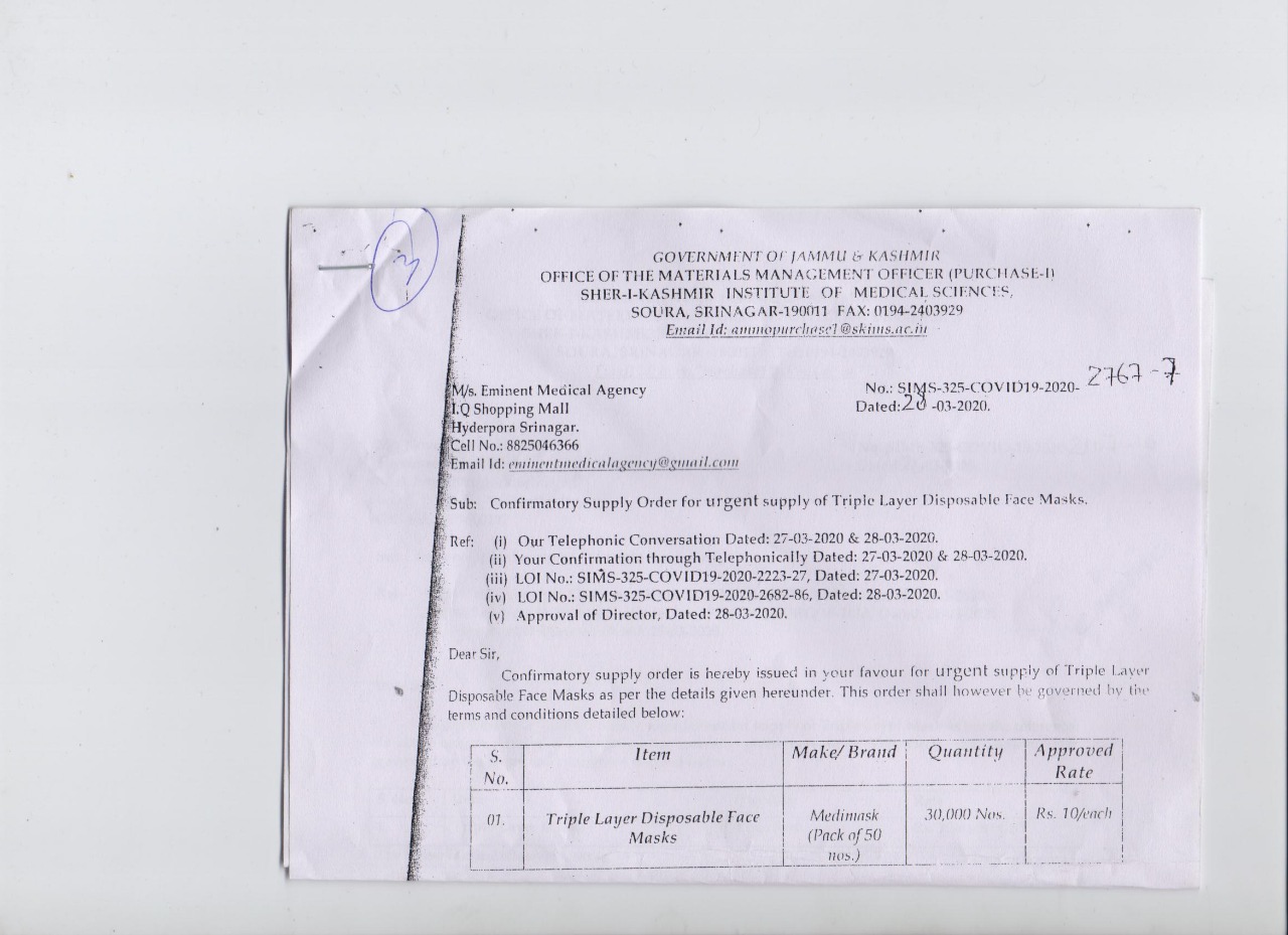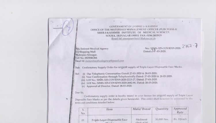 سرینگر // کے پی ایس : صورہ میڈیکل انسٹی چیو ٹ میں جا ری بے ضابطگیو ں اور اقربا ءپر وری کے بیچ انسٹی چیو ٹ نے کورونا وائرس کی آڑ میں محض تین دن کے اندر چار لاکھ تیس ہزار ماسک مہنگے داموں خر ید کر دو مقامی میڈ یکل ایجنسیوں کو لاکھوں روپے کا فائدہ پہنچا یا ہے جبکہ ذرائع کا کہنا ہے کہ اس دوران انسٹی چیو ٹ کے حکام نے کمیشن کی بھا ری رقم اپنی جیبوں میں بھر لی ۔کشمیر پریس سروس کے مطا بق صورہ میڈیکل انسٹی چیو ٹ نے ایک ٹینڈر نو ٹس زیر نمبر SIMS-325-COVID-19-2020جا ری کر دی جس کے تحت رجسٹرڈ میڈیکل سپلا ئرس سے فیس ما سکس کی سپلائی طلب کی گئی ۔ٹینڈر نوٹس جا ری کر نے کے بعد انسٹی چیو ٹ نے NOVO Life Healthcareنا می ڈیلر کو ٹینڈر الاٹ کیا اور مذکو رہ ڈیلر سے 4لاکھ فیس ما سکس 10رو پے فی کس کے حساب سے لی گئیں جس کی قیمت 40لاکھ بن جا تی ہے کیونکہ ایک فیس ما سک کی با زار میں قیمت محض دو یا اڑھا ئی رو پے ہے ۔