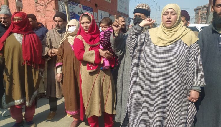 سانبہ جموں میں گرفتار کئے گئے اننت ناگ کے شہری کے اہلخانہ کا پریس کالونی میں احتجاج ؛ کہا ظہور احمد کی کسی جنگجوتنظیم سے کوئی وابستگی نہیںہے بلکہ وہ عام شہر ی ، ان کی رہائی کا کیا مطالبہ