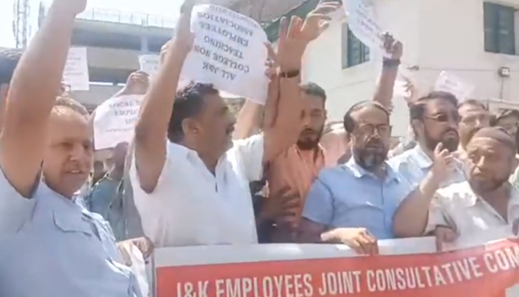 سری نگر، ایمپلائز جوائنٹ ایکشن کمیٹی (ای جے اے سی سی) نے پیر کے روز یہاں پریس کالونی میں اپنے مطالبات کے حق میں احتجاج درج کیا۔