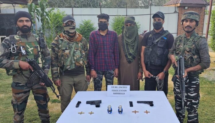 بارہمولہ میں سیکورٹی فورسز نے لشکر طیبہ (ٹی آر ایف) سے وابستہ دو ہابرڈ ملی ٹینٹوں کو قابل اعتراض مواد سمیت حراست میں لینے کا دعویٰ کیا ہے۔ پولیس کے ایک ترجما ن نے بتایاکہ 21ستمبر 2023 کو معتبر ذرائع سے اطلاع موصول ہوئی کہ یاسین احمد شاہ ولد طاریق احمد ساکن جانباز پورہ بارہ مولہ گھر سے لاپتہ ہو گیا اور اس نے کالعدم دہشت گرد تنظیم لشکر طیبہ (ٹی آر ایف) میں شمولیت اختیار کر لی ہے۔ پولیس نے معاملے کی نسبت کیس درج کرکے تحقیقات شروع کی۔