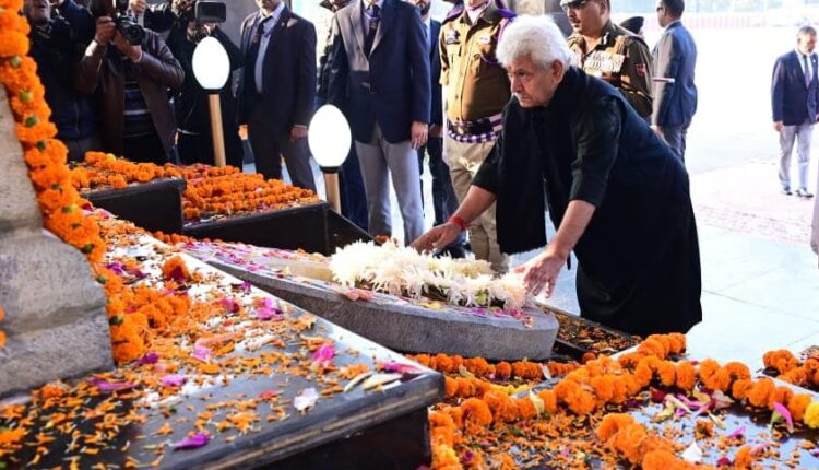 سری نگر، جموں وکشمیر کے لیفٹیننٹ گورنر منوج سنہا نے ہفتے کی صبح پولیس کے یاد گاری دن کے موقع پر یہاں زیون علاقے میں واقع آرمڈ پولیس کمپلیکس میں قوم کے لئے قربانیاں پیش کرنے والے پولیس اہلکاروں کو شاندار خراج عقیدت پیش کیا اور پھولوں کی چادر چڑھائی۔
