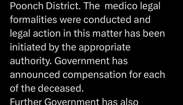 ۔ایکس پر ایک پوسٹ میںمحکمہ اطلاعات و رابطہ عامہ جموں کشمیر نے لکھا ” پونچھ کے بلعفاز علاقے میں جمعہ کو تین عام شہری کی موت کی اطلاع ملنے کے بعد تمام ضروری لوازمات اد ا کی گئی اور اس کے ساتھ ہی مجاز اتھارٹی کے ذریعہ اس معاملے میں قانونی کارروائی شروع کر دی گئی ہے“۔انہوں نے مزید لکھا ”حکومت نے ہر مرنے والوں کے حق میں معاوضے کا اعلان کیا ہے
