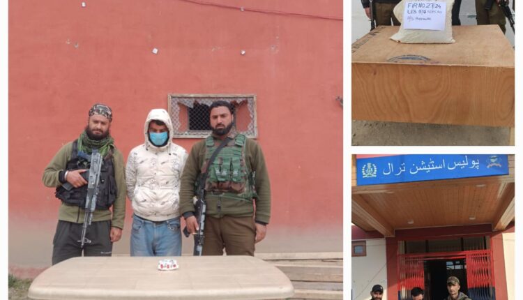 پولیس اسٹیشن ترال کی پولیس پارٹی نے بجوانی کے قریب ناکہ چیکنگ کے دوران ایک منشیات فروش کو گرفتار کیا جس کے قبضے سے 2000 نشیلی ٹیکے بر آمد ہوئے ۔ اس کی شناخت محمد امین ملک ولد غلام نبی ملک ساکنہ لرگام ترال کے طور پر ہے ۔