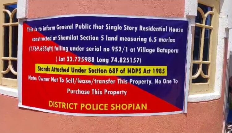 نمائندے مزمل یعقوب نے تفصیلات فراہم کرتے ہوئے بتایا کہ سماج سے منشیات کو ختم کرنے کیلئے اپنی کوششوں کے تسلسل میں ضلع پولیس شوپیاں نے ایس ایس پی شوپیان تنوشیری کی نگرانی میں بدنام زمانہ منشیات کے کاروباری سے تعلق رکھنے والے لاکھوں روپئے کی جائےد ضبط کی۔ اس جائےد مےں دو منزلہ رےا ےشی مکان مہجبین بانوزوجہ فاروق احمد نجار ساکن اسٹیڈیم کالونی بٹہ پورہ شوپیاں کے نام درج ہے اور ےہ گا¶ں بٹہ پورہ ضلع شوپیاں میں سروے نمبر 952/1 کے تحت آنے والی شملات سیکشن 5 اراضی پر 6.5 مرلہ (1769.63 مربع فٹ) تعمیر کی گئی۔یہ کارروائی 1985 کے NDPS ایکٹ کے تحت کی گئی تھی اور اس کا تعلق پولیس اسٹیشن شوپیاں کے NDPS ایکٹ کے ایک کیس میں کی گئی ۔