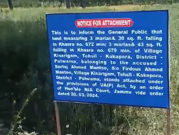 ترجمان کے مطابق این آئی اے کی خصوصی عدالت جموںکی اجازت نامہ کے بعد دہشت گرد سرتاج احمد منٹو کی جائیداد پلوامہ ضلع کے کساریگام میں 19 مرلہ اور 84 مربع فٹ اراضی کو یوے ( پی ) ایکٹ 1967 کی دفعہ 33 (1) کے تحت ضبط کیا گیا۔