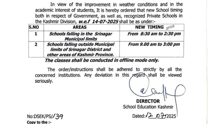 محکمہ اسکولی تعلیم نے سرینگر کی میونسپل حدود اور وادی کشمیر میں 14 جولائی سے موسم میں بہتری کے بعد اسکولوں کے اوقات میں تبدیلی کا اعلان کیا۔