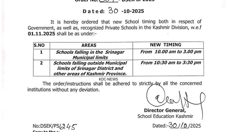ڈائریکٹرجنرل آف سکول ایجوکیشن کشمیر نے جمعہ کو کشمیر صوبے کے سکولوں کے اوقات میں تبدیلی کا حکم دیا ہے ۔ اس ضمن میں جاری ایک حکمنامہ کے مطابق سرینگر میونسپل حدود کے اندر تمام سرکاری اور نجی اسکولوں میں اسکول کا وقت صبح 10بجے سے دوپہر 3بجے تک ہوگا۔