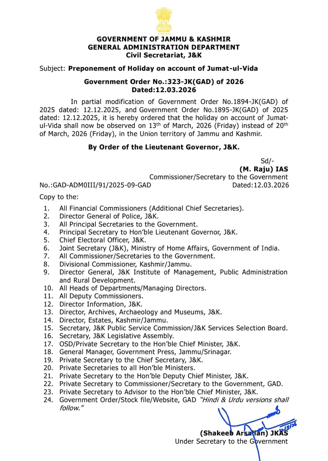 اس ضمن میں جاری ایک سرکاری حکمنامہ کے مطابق پہلے جاری کرد ہ حکمنامہ میں ترمیم کرتے ہوئے یہ اعلان کیا جاتا ہے کہ جمعتہ الوداع کی جو تعطیل 20مارچ کو مقرر تھی اب وہ کل یعنی 13مارچ 2026کو ہوگی