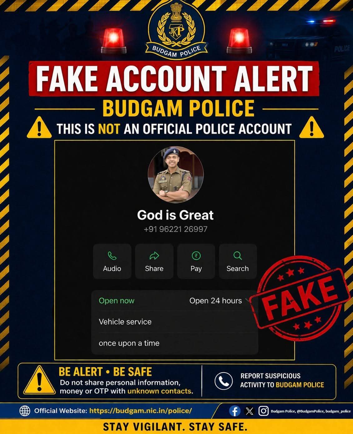 پولیس بیان کے مطابق پولیس تھانہ بڈگام کو مصدقہ اطلاع موصول ہوئی ہے کہ سمیر علی بٹ ولد غلام محمد بٹ ساکنہ پلر بڈگام عام لوگوں میں ایس ایس پی بڈگام کے نام سے چلنے والے جعلی واٹس ایپ اکا¶نٹ سے چیٹس کے اسکرین شاٹس شیئر کر رہا تھا اور لوگوں کو متاثر کرنے کے لیے اپنا قریبی ساتھی ظاہر کر رہا تھا۔تصدیق کرنے پر پتہ چلا کہ مذکورہ شخص متعدد ایف آئی آر میں ملوث ہے اور موبائل نمبر9622126997کا استعمال کرتے ہوئے ایس ایس پی بڈگام کے نام پر جعلی واٹس ایپ اکا¶نٹ چلا رہا تھا۔